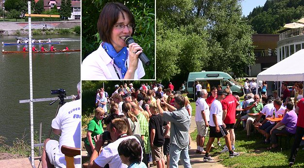 Regattaleiterin Tanja Günder (kleines Bild), eine erfahrene Regattasprecherin des Deutschen Ruderverbandes, kommentierte die Rennen für die Zuschauer. RGE-Mitglieder sorgten für ein reichhaltiges Bewirtungsangebot.