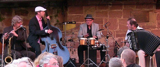 Am Freitagabend fand im Hof am Pulverturm ein gut besuchtes Konzert der Gruppe "Les Primitifs" statt (unser Bild). Mit Laurent Leroi am Akkordeon saß ein echter Franzose auf der Bühne. Die Band bot eine Mischung aus französischer Musette, Latin, Klezmer und Jazz. Die Gäste waren in bester Feierlaune und bewiesen Organisationstalent: Vom Markt gab es Wein, Käse, Wurst, Oliven und Crêpes. Wasser und Brot kaufte man spontan bei umliegenden Unternehmen.
