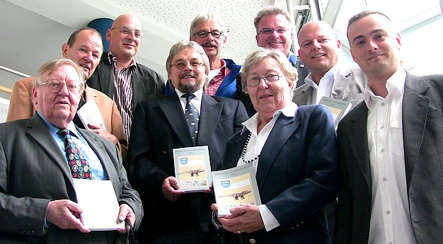 Periodisches Werk zur Zeitgeschichte wird farbiger Schriftleiter Dr. Rüdiger Lenz (Mitte) mit seinem Autorenteam und Michael Teppner von der GELITA AG (2.v.r.). (Foto: Claudia Richter)(cr) Das "Eberbacher Geschichtsblatt 2011" ist erschienen. Im Rathaus wurde das druckfrische Werk zur Zeitgeschichte heute von Bürgermeister Bernhard Martin, Schriftleiter und Stadtarchivar Dr. Rüdiger Lenz und allen beteiligten Autoren vorgestellt.