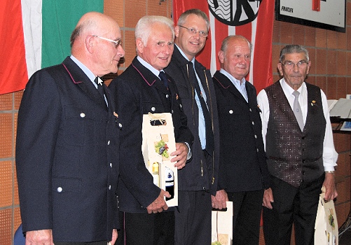 Zur Freude der anwesenden Gäste wurden die vier Gründungsmitglieder Heinrich Schleuning, Helmut Siefert, Georg Rexroth und Adolf Emig geehrt. Erhard Kabel und Heinrich Schleuning wurden für 60 Jahre Vereinszugehörigkeit ausgezeichnet. Sie bekamen von KBI Friedrich das goldene Ehrenzeichen am Bande des Bezirksfeuerwehrverbandes Hessen-Darmstadt überreicht. Mit dem Silbernen Ehrenzeichen des Feuerwehrverbandes für besondere Verdienste und aktive Mitgliedschaft wurden Rüdiger Badstieber und Heinz Rodemich ausgezeichnet.