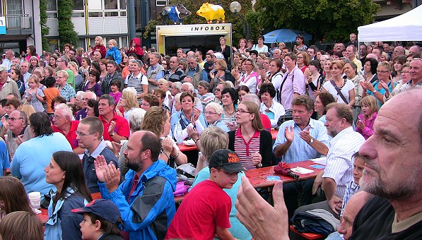 Eine bunte und abwechslungsreiche Show mit Spaß, Klamauk und Musik hatte das Organisationsteam unter Federführung von Karin Uhrig (Kulturamt) auf die Beine gestellt. Nach einer Verzögerung wegen eines kräftigen Regenschauers ging es kurz nach 18 Uhr auf der mobilen Showbühne, dem "Actiontruck", mit der Anmoderation durch RNF-Sprecherin Frauke Hess los. Einen fulminanten Auftritt hatte Bürgermeister Bernhard Martin, der auf einem Hundeschlitten vor die Bühne rollte, gezogen von den Lindacher Huskys. Den Weg durch die Zuschauermassen bereitet hatten ihm die Eberbacher Herolde, gefolgt vom Fanfarenzug. Die Singschule bot ein Medley aus dem Kindermusical "Leben im All". Für weitere Gesangseinlagen sorgten mehrere Eberbacher Chöre, die unter Leitung von Bezirkskantor Achim Plagge einen Kanon anstimmten, und Mitglieder des Gemeinderats, die in Abwandlung eines bekannten Volkslieds und passend maskiert "Der Kuckuck und der Eber" vortrugen. In Quizspielen waren neben dem Bürgermeister auch Triathlet Timo Bracht sowie die beiden Schulleiterinnen Regine Sattler-Streitberg und Stefanie Srivastava gefordert. Einen feucht-fröhlichen Wettstreit lieferten sich die drei Eberbacher Fußballvereine: Mit Schwämmen auf dem Kopf galt es, möglichst viel Wasser vom Brunnen in Eimer vor der Bühne zu transportieren. Der BUND ließ Kinder als Krötenpaare zwischen Bobbycars hindurch zum "Laichplatz" (ebenfalls der Brunnen) laufen. Die "Hallodries" der KG Kuckuck ließen die britische Palastwache und die Queen tanzen und durften eine übergroße "Viktoria-Torte" von der gleichnamigen Konditorei in Empfang nehmen. Tanz und Gymnastik verband die "Step Machine" des TV Eberbach in ihrem Auftritt, und für musikalische Unterhaltung zwischendurch und nach der Show sorgte die Eberbacher Band "61Inch". Die Stadtwette schaffte Eberbach ganz souverän. Es gelang nämlich, die Elferräte der drei örtlichen Karnevalvereine mitsamt Prinzenpaar in voller Montur auf die Bühne zu bringen. Alle zusammen sangen zum Abschluss das "Badener Lied".