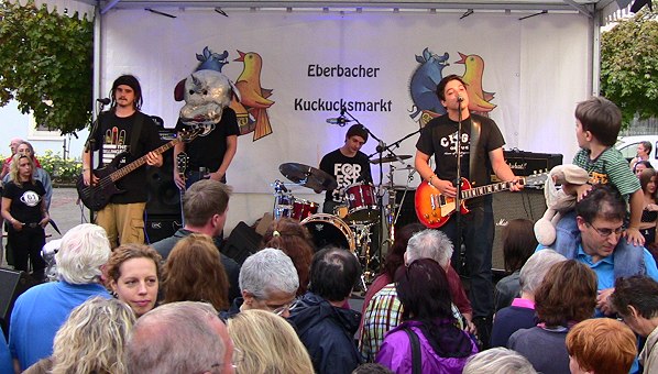 Eine bunte und abwechslungsreiche Show mit Spaß, Klamauk und Musik hatte das Organisationsteam unter Federführung von Karin Uhrig (Kulturamt) auf die Beine gestellt. Nach einer Verzögerung wegen eines kräftigen Regenschauers ging es kurz nach 18 Uhr auf der mobilen Showbühne, dem "Actiontruck", mit der Anmoderation durch RNF-Sprecherin Frauke Hess los. Einen fulminanten Auftritt hatte Bürgermeister Bernhard Martin, der auf einem Hundeschlitten vor die Bühne rollte, gezogen von den Lindacher Huskys. Den Weg durch die Zuschauermassen bereitet hatten ihm die Eberbacher Herolde, gefolgt vom Fanfarenzug. Die Singschule bot ein Medley aus dem Kindermusical "Leben im All". Für weitere Gesangseinlagen sorgten mehrere Eberbacher Chöre, die unter Leitung von Bezirkskantor Achim Plagge einen Kanon anstimmten, und Mitglieder des Gemeinderats, die in Abwandlung eines bekannten Volkslieds und passend maskiert "Der Kuckuck und der Eber" vortrugen. In Quizspielen waren neben dem Bürgermeister auch Triathlet Timo Bracht sowie die beiden Schulleiterinnen Regine Sattler-Streitberg und Stefanie Srivastava gefordert. Einen feucht-fröhlichen Wettstreit lieferten sich die drei Eberbacher Fußballvereine: Mit Schwämmen auf dem Kopf galt es, möglichst viel Wasser vom Brunnen in Eimer vor der Bühne zu transportieren. Der BUND ließ Kinder als Krötenpaare zwischen Bobbycars hindurch zum "Laichplatz" (ebenfalls der Brunnen) laufen. Die "Hallodries" der KG Kuckuck ließen die britische Palastwache und die Queen tanzen und durften eine übergroße "Viktoria-Torte" von der gleichnamigen Konditorei in Empfang nehmen. Tanz und Gymnastik verband die "Step Machine" des TV Eberbach in ihrem Auftritt, und für musikalische Unterhaltung zwischendurch und nach der Show sorgte die Eberbacher Band "61Inch". Die Stadtwette schaffte Eberbach ganz souverän. Es gelang nämlich, die Elferräte der drei örtlichen Karnevalvereine mitsamt Prinzenpaar in voller Montur auf die Bühne zu bringen. Alle zusammen sangen zum Abschluss das "Badener Lied".