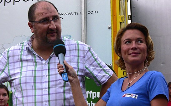 Ab 26. August darf abgestimmt werden Bernhard Walter erläutert Moderatorin Tinas Ries die "Wasserschlacht" der Fußballvereine. (Foto: Hubert Richter)Mehr Bilder (Klicken zum Vergrößern):