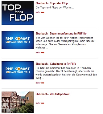Auch auf der RNF-Website wurden inzwischen einige Videos über Eberbach veröffentlicht (Link s.u., dort Klick auf "Videos zur Sendung"). RNF zählt die Klicks auf die Videos und erstellt aus dem Ergebnis eine Rangfolge der beteiligten Kommunen, die über weitere Punkte im Wettbewerb entscheidet.