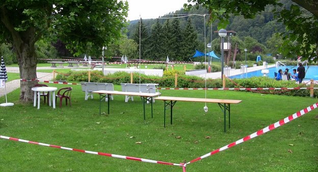 Wettergott hatte kein Einsehen - Wassertiere sind für Samstag geplant (Foto: Hubert Richter)(bro) (ul) Am vergangenen Samstag war man im Eberbacher Freibad für den sommerlichen Spielenachmittag eingerichtet und hatte sich einen interessanten Parcours einfallen lassen. Nur das Wetter machte wieder einmal einen Strich durch die Rechnung.