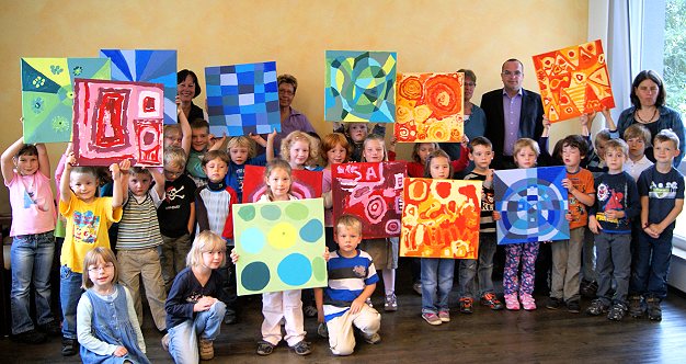 Am letzten Mittwoch konnte Bürgermeister Jan Frey die gelungenen Bilder aus den Händen der Kinder in Empfang nehmen und war sichtlich begeistert: „Einfach spitze, so schöne Bilder habe ich noch nicht gesehen. Woanders muss man dafür viel Geld bezahlen“, lobte er die Maxis für ihre Malerei.