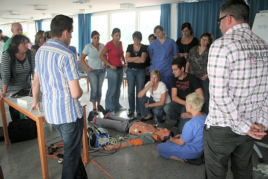 (bro) (sch) Am Freitag, 15. Juli, fand ein Reanimationstraining im Dachgarten der GRN Klinik Eberbach statt. Organisiert wurde diese Veranstaltung von der Abteilung für Anästhesie und operative Intensivmedizin durch Oberarzt Patrick Schottmüller zusammen mit dem Deutschen Roten Kreuz Heidelberg. Hierzu reisten der stellvertretende Wachenleiter der DRK Rettungswache Heidelberg, Christoph Raabe, und der Lehrrettungsassistent Mathias Wagner aus Heidelberg an.