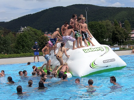 In gespannter Erwartung konnten es die Kinder und Jugendlichen kaum erwarten, bis "Nelly" und "Iceberg" endlich sicher befestigt und zum Erklimmen freigegeben waren. Sofort war der "Iceberg" mit einer Traube von begeisterten Kletterern besetzt, die ihren Platz verteidigten und gar nicht mehr hinunter wollten. Bald hatte jedoch jeder festgestellt, dass es ebenso viel Spaß machte, den "Iceberg"hinunterzurutschen oder mit einem beherzten Köpfer hinunterzuspringen, als nur oben zu sitzen. So konnten die quirligen Teilnehmer die Schwimmgeräte immer und immer wieder erklimmen. Da verging der Nachmittag wie im Flug, und die meisten Freibadbesucher hätten die Schwimmtiere am liebsten gleich jeden Samstag zum Spielen.