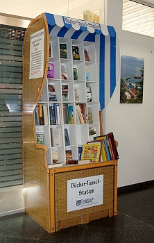 Bücher-Strandkorb im Foyer des Rathauses (Foto: privat)(bro) (stve) Seit kurzer Zeit gibt es eine Bücher-Tausch-Station im Foyer des Eberbacher Rathauses. Unter dem Motto „Lassen Sie Ihre Bücher frei“ können Leseratten ihre bereits gelesenen Bücher gegen ein anderes interessantes Buch eintauschen.