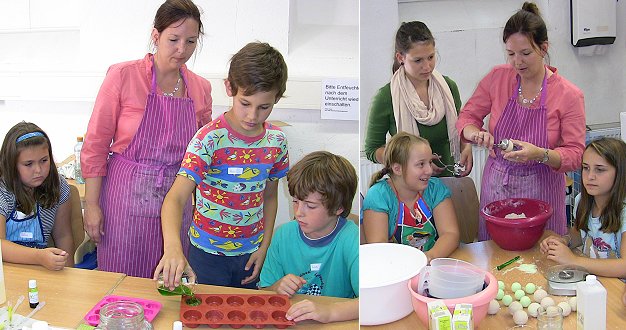 Jessica Freudenberger von der Seifenmanufaktur Vintage aus Schwarzach und ihre Tochter Jacqueline zauberten gemeinsam mit den Kindern bunte Badebonbons, wohlriechende Sprudelkugeln und Seifen in unterschiedlichen Formen und Düften - Badekreationen aus natürlichen Inhaltsstoffen mit Kräutern und Blüten, die die Kinder nach dem Miniworkshop mit nach Hause nehmen durften.