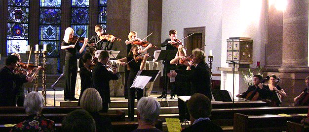 Die 15 Musikerinnen und Musiker im Alter zwischen 17 und 24 Jahren boten unter Leitung von Thomas Kalb ein Programm mit der Streichersinfonie h-Moll von Felix Mendelssohn Bartholdy, dem Streichquintett e-Moll von Louis Theodore Gouvy und der Kammersinfonie c-Moll von Dmitri Schostakowitsch.
