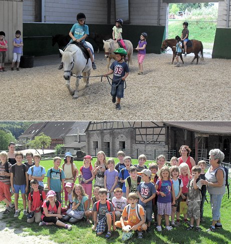 Los ging es mit dem Zug Richtung Michelstadt. Dort stieg die Gruppe am Bahnhof aus und fuhr noch mit dem Bus nach Rehbach. Auf dem Erlebnishof wurden die Kinder von dem Besitzer begrüßt. Er teilte ihnen ein paar Regeln mit, und danach sprangen sie alle los und waren vollauf beschäftigt. Bald gab es nur noch erhitzte und verschwitzte Gesichter. Mittags gab es dann verschiedene Bratwürste, Pommes frites und Salat. Gleich darauf stürmten die Kinder wieder los. Um 14 Uhr kam ein weiterer Höhepunkt, nämlich das Ponyreiten, an dem fast alle Kinder teilnahmen. Anschließend gab es noch kalten Kaba und Kekse. Viel zu schnell war die Zeit vorbei, und um 14.45 Uhr trat man die Heimreise an.