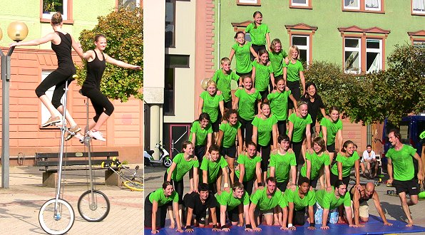 Junge Freizeitartisten zeigten ihr Können (Fotos: Claudia Richter)(cr) Das Evangelische Kinder- und Jugendwerk Heidelberg mit Bezirksjugendreferentin Sibylle Holzwarth und Zirkuspädagoge und -artist Peter Böhne veranstalten dieser Tage eine Zirkus-Fahrrad-Aktivfreizeit. Die Akteure besuchten gestern Eberbach und zeigten ihr akrobatisches Können auf dem Leopoldsplatz.
