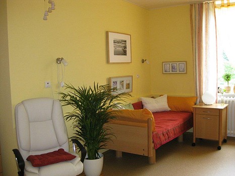 Nun kann der Dienst jedoch auch den Bedürfnissen der Menschen gerecht werden, deren Verbleib zuhause in der Sterbephase aus persönlichen Gründen nicht möglich ist. Das Leitungsteam ist froh, dass nach einer längeren Vorlaufzeit im Rockenauer Seniorenstift „Curata“ ein behagliches Hospizzimmer bereitsteht (unser Bild), das sterbenden Menschen zur Verfügung gestellt werden kann und das - mit einer zusätzlichen Schlafmöglichkeit ausgestattet - auch Angehörigen eine Übernachtungsmöglichkeit bietet. Vorteil dabei ist, dass Pflege und Versorgung durch die Mitarbeiter von Curata gewährleistet ist und die zusätzliche Begleitung nach Wunsch und Bedarf durch die Mitarbeiter des Hospizdienstes erfolgt.
