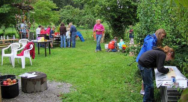 In der Au entstand ein Hotel für Insekten (Foto: Doris Lenz)(dl) Nicht nur auf dem Kuckucksmarkt, sondern auch im interkulturellen Garten in der Au ging es am Samstag lebhaft zu. Im Rahmen des Ferienprogramms hatten die Gartenfrauen, vertreten durch Ulrike Rothfuß und Doris Lenz gemeinsam mit Christina Kunze und Nina Schuster von der NAJU-“Waldbande” zum Bau eines Insektenhotels eingeladen.