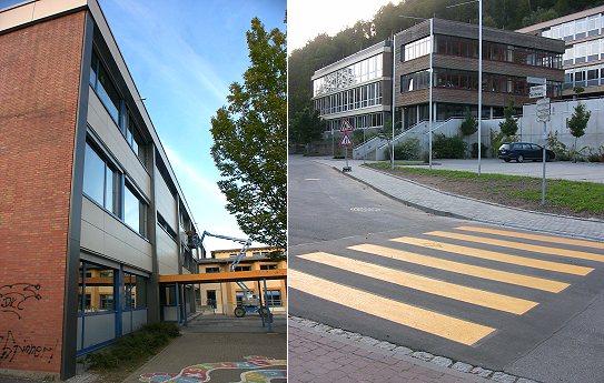 Die energetische Sanierung der Werkrealschule (Bild links) habe man fristgerecht abschließen können und damit auch die Fördergelder für die Stadt gesichert. Gleiches gelte für die Brandschutzmaßnahmen am Hohenstaufen-Gymnasium. Dort wurde auch ein Gehweg und Zebrastreifen für die sichere Schulwegquerung auf dem Karlstalweg angelegt (Bild rechts).