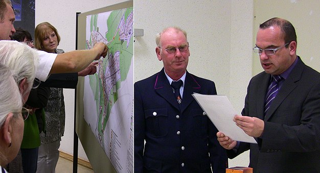 Konzepte für Entwicklung zum attraktiven Wohndorf Erläuterung der Dorfentwicklungskonzepte durch Ines Breiding. Rechts Bürgermeister Jan Frey mit dem wiedergewählten Feuerwehrkommandanten der Abteilung Schwanheim, Berthold Göhrig. (Fotos: Hubert Richter)(hr) Über die neuen Dorfentwicklungskonzepte für vier der fünf Ortsteile konnten sich Schönbrunner Bürgerinnen und Bürger in der Gemeinderatssitzung am vergangenen Donnerstag informieren. Landschaftsarchitektin Ines Breiding vom Mosbacher Ingenieurbüro für Kommunalplanung (IfK) stellte die Pläne vor.