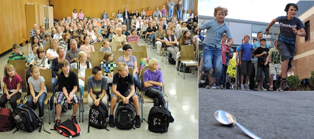 87 Fünftklässler feierlich eingeschult - Begrüßung auch durch die SMV 87 neue Fünftklässler wurden zum Schuljahresbeginn am Hohenstaufen-Gymnasium Eberbach begrüßt. In der ersten Großen Pause gab es dann zudem eine kleine Party der SMV mit Musik, Gebäck und Spielen. (Fotos: privat)(bro) (pm) Zu Beginn des neuen Schuljahres 2011/2012 wurden am Hohenstaufen-Gymnasium 87 Fünftklässler von Oberstudiendirektor Helmut Schultz begrüßt. Bei einer Feier in der Schulaula wurden die Schülerinnen und Schüler dann auf ihre drei Klassen verteilt und lernten ihre Klassenlehrerinnen Melanie Merscher (Klasse 5a), Liv Knecht (Klasse 5b) und Angela Träger (Klasse 5c) kennen. Eine vierte Klasse war wegen des Klassenteilers knapp nicht zustande gekommen, sodass einige Schüler aus Hirschhorn ans Gymnasium Neckargemünd mussten. Während sich die Fünftklässler gegenseitig beschnupperten, wurden die zahlreich erschienenen Eltern und Großeltern vom Verein der Freunde des HSG auf ein Glas Sekt zur Feier des Tages eingeladen. In der verlängerten Großen Pause begrüßte dann auch die Schülermitverantwortung (SMV) alle HSG-Schüler nach den Sommerferien mit einer kleinen Party und Spielen für die Unterstufe.
