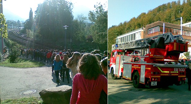 Schule musste zweimal evakuiert werden (Fotos: privat)(cr) Ein defekter Brandmelder hielt heute Vormittag Schüler und Lehrer am Hohenstaufen-Gymnasium auf Trab. Zweimal musste die Schule evakuiert werden und die Feuerwehr anrücken, weil falsche Alarme ausgelöst wurden.