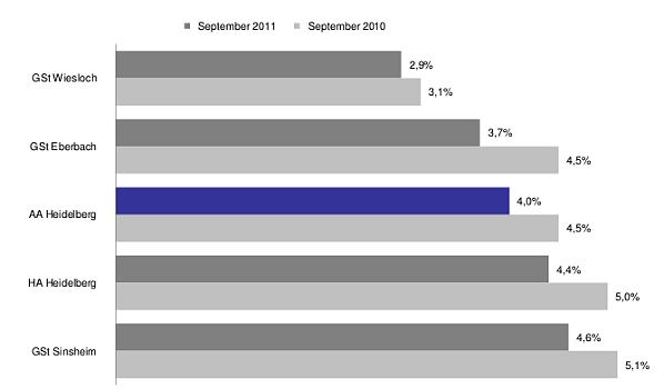 Regionaler Arbeitsmarkt weiter in einer guten Verfassung Arbeitslosenquoten im September 2011. (Grafik: Bundesagentur für Arbeit)(bro) (aa) Ende September waren im Bezirk der Agentur für Arbeit Heidelberg 8.777 Menschen arbeitslos gemeldet - 517 weniger als im August, 1.062 weniger als vor einem Jahr. Die Arbeitslosenquote im Gesamtbezirk ging um 0,3 auf 4,0 Prozent zurück. Vor einem Jahr waren es noch 4,5 Prozent.