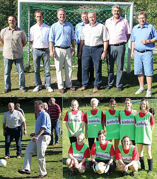 Bürgermeister Martin beim Torwandschuss und die Dielbacher Frauenmannschaft vor ihrem Match gegen die Frauen der "Pleutersbacher Löwen". (Fotos:Wörner)(tw) Heute Nachmittag wurde der Bolzplatz in Unterdielbach mit Ansprachen, Torwandschießen, Festbewirtung und einem Freundschaftsspiel offiziell seiner Bestimmung übergeben.