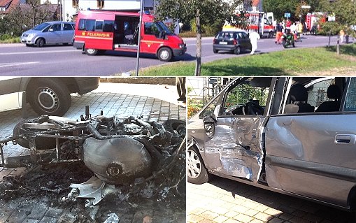 Eine 40-jährige Opel-Fahrerin war auf der Haager Straße in Richtung Haag unterwegs und wollte nach links in den Ostring abbiegen. Beim Abbiegevorgang wurden sie und ein hinter ihr fahrender Pkw von einem Motorradfahrer überholt. Der 33-jährige Yamaha-Fahrer kollidierte mit dem Opel im Bereich der Fahrertür. Er stürzte und geriet dabei unter sein Motorrad. Unmittelbar darauf fing die Yamaha Feuer. Dabei zog sich Biker schwere Verbrennungen zu, bevor er unter dem Motorrad hervorgezogen werden konnte. Er wurde mit einem Hubschrauber in eine Spezialklinik nach Ludwigshafen gebracht. Die Opel-Fahrerin und zwei mitfahrende Kinder zogen sich leichte Verletzungen zu, die im Krankenhaus Eberbach ambulant behandelt wurden.