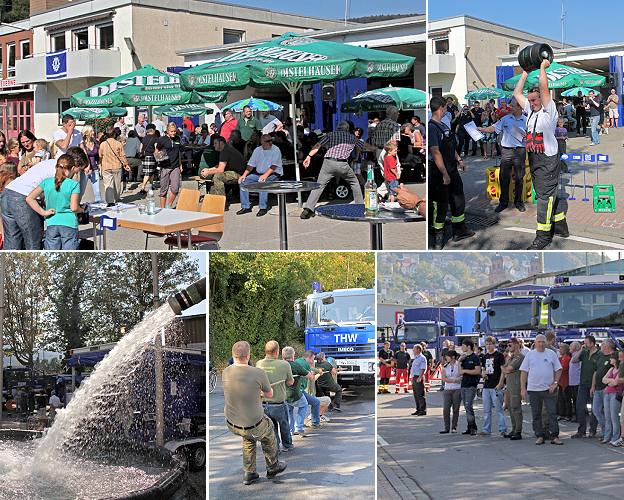 Um 10.30 Uhr ging es los, die Güterbahnhofstraße war in Höhe des THW gesperrt, die großen Einsatzfahrzeuge machten in der großen Halle Platz für Biertischreihen und konnten gegenüber vor dem Hang zum Bahngelände besichtigt werden. Wer wollte, konnte sich Details erklären lassen. Für das leibliche Wohl sorgte der THW Förderverein Eberbach e.V. mit bayrischen Spezialitäten wie Weißwürsten und Schweinshaxen, dazu gab es auch zünftigen Gerstensaft und weniger gehaltvolle Getränke. Ein besonderer Blickfang war ein künstlicher Wasserfall in ein 15.000 Liter fassendes Auffangbecken, mit dem die Fachgruppe Wasserschaden/Pumpen das Leistungsvermögen ihrer Hochleistungspumpe mit 5000 Litern pro Minute augenfällig demonstrieren konnte. Hinter der Fahrzeughalle hatten Kinder der Gäste, betreut von der THW-Jugend, die Möglichkeit, ihr handwerkliches Geschick unter Beweis zu stellen. Gern geübt wurde das Zielspritzen. Um 13 Uhr war dann Zeit für das Kräftemessen, die neugierigen Zuschauer sammelten sich an der 40-Meterstrecke, um ihre Favoriten anzufeuern. GKW-Pulling stammt wohl aus dem Kürzelverzeichnis des Technischen Hilfswerks und meint einen Wettbewerb, bei dem Mannschaften mit einem langen Seil einen tonnenschweren Gerätekraftwagen über einen gewisse Strecke ziehen müssen. Dass dabei der Motor lief, hatte nur technische Gründe. Die Zeitvorgabe der außer Wertung antretenden THW-Mannschaft von 46 Sekunden wurde von zwei Siegermannschaften unterboten. Die sechs bärenstarken Wehrmänner der FFW-Eberbach brauchten sogar nur knapp über 40 Sekunden. Auch die Reservistenkameradschaft unterbot die Vorgabe mit 45,72 Sekunden. Dritter wurde der Freundeskreis 1. FC Wadenkrampf. Die DLRG und das DRK sammelten erste Erfahrungen mit dieser Sportart. Als Siegestrophäe winkte ein Fass Bier, sowohl für die Platzierten als auch allen anderen Teilnehmerteams gab es Sixpacks in unterschiedlichen Mengen. Den Sonderpreis für den größten erkennbaren Fanclub erhielt ebenfalls die Feuerwehr Eberbach und freut sich bereits auf eine Brauereibesichtigung in Distelhausen. Nachmittags ließen es sich die Besucher bei Kaffee und Kuchen gut gehen und den Tag bis gegen Abend gemütlich ausklingen.