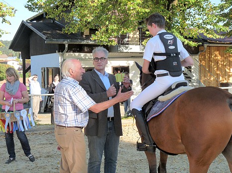 Die angebotenen Pr�fungen reichten von der F�hrz�gelklasse f�r die J�ngsten bis hin zu Dressuren und Stilspringen der A-Klasse. Dabei waren das A-Springen und die A-Dressur als �Preis der Sparkasse Neckartal-Odenwald� ausgeschrieben, ein weiteres A-Springen als �Preis der Fahrschule Mayer/Berres�. F�r die Eberbacher Sparkasse �berreichte Gerhard Daum die gestifteten Ehrenpreise.