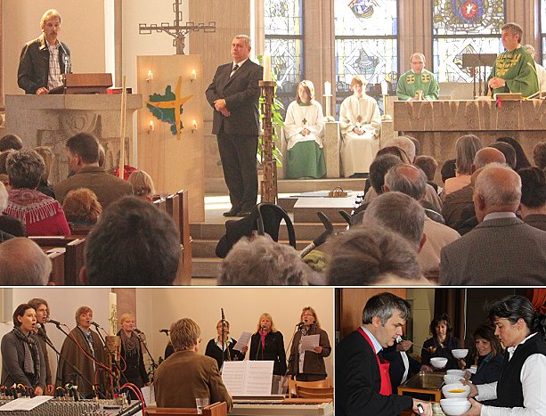 der Begrüßung von Joachim Szendzielorz. Der Singkreis unter der Leitung von Godehard Weithoff. Pfarrer Stößer und der Pfarrgemeinderat von St. Johannes Nepomuk bei der Ausgabe des Mittagessens. (Fotos:Wörner)(tw) Am der Tag Seelsorgeeinheit am vergangen Sonntag in der katholischen Pfarrgemeinde St. Johannes Nepomuk wurde gleichzeitig das 10-jährige Bestehen der Kooperation in einem festlichen Gottesdienst zu Ehren der Namenspatronin Edith Stein gefeiert