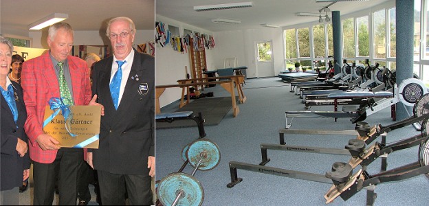 Inschrift geehrt. Rechts: Der neue Trainingsraum der RGE. (Fotos: Ellen Wartner)(bro) (ewa) Pünktlich zu Beginn der kalten Jahreszeit ist er fertig geworden, der neue, 108 Quadratmeter große Trainingsraum der Rudergesellschaft. Niemand freut sich mehr darüber, als Trainer Frank Günder und seine Rennmannschaft. Die Einweihung wurde gebührend gefeiert. Mit vielen Gästen.