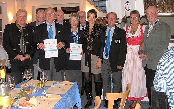 Ehrung der Vereinsjubilare (Foto: Ellen Wartner)(bro) (ewa) Im Rahmen der Einweihungsfeier für den neuen Trainingsraum der RGE kamen auch Vereinsjubilare zu Ehren. Die RGE-Ehrennadel in Silber für 25-jährige Mitgliedschaft erhielten Ferdinand Veith und Ernst Melzner. Seine Tochter Edith Schiml nahm sie für ihn in Empfang. Mit der goldenen Vereinsehrennadel wurden Karin Schmitt-Brinks, Rolf Lüttich, Wolfgang Müller und Heiko Schreiber ausgezeichnet. Und die goldene Ehrennadel des Deutschen Ruderverbandes für 50-jährige Mitgliedschaft konnte RGE-Vorsitzender Bernd Toenneßen an seine Stellvertreterin Theresia Wagner und an Klaus Bruchmann überreichen.
