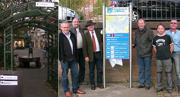 Per Infotafeln zu Sehenswürdigkeiten und Hotels Enthüllung der ersten Hinweistafel am Neckarlauer. Links die Testbeschilderung vor genau einem Jahr am Lindenplatz. (Fotos: Hubert Richter / Claudia Richter)(cr) Mit einer feierlichen Enthüllung wurden heute am Neckarlauer die ersten Hinweistafeln im Rahmen der neuen touristischen Beschilderung in der Eberbacher Innenstadt der Öffentlichkeit vorgestellt.