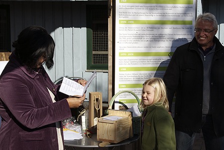 Einzigartige Verbindung von Ökologie und Ökonomie Glücksfee Hannah zog unterstützt von Bürgermeister Klaus Schölch und Marina Hofherr als Vertreterin der Veranstaltergemeinschaft die Gewinner des Mostquiz des NABU Waldbrunn. (Foto: Hofherr)(hof) Bei wunderschönem Herbstsonnenschein klangen am Sonntag die 2. Waldbrunner Mostwochen aus. Eingeladen hatte das Kurgestüt Hoher Odenwald, wo Hausherr Hans Zollmann, Bürgermeister Klaus Schölch und Marina Hofherr im Namen der Veranstaltergemeinschaft die Gäste, darunter den Vorsitzenden des NABU Waldbrunn, Ernst Stephan, sowie die Kreisrätin Christine Denz begrüßten.