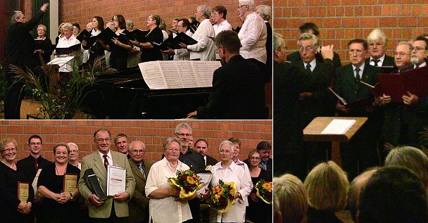 90 Jahre Gesang und Geselligkeit - Ehrung langjähriger Vereinsmitglieder Links oben der Jubiläumschor beim gestrigen Auftritt, darunter die anwesenden Geehrten. Rechts der MGV Concordia. (Fotos: Claudia Richter)(cr) Der Gemischte Chor Lindach 1921 e.V. feiert in diesem Jahr sein 90-jähriges Bestehen. Gestern Abend lud der Verein zum Jubiläumskonzert im Evangelischen Gemeindehaus in Eberbach ein.