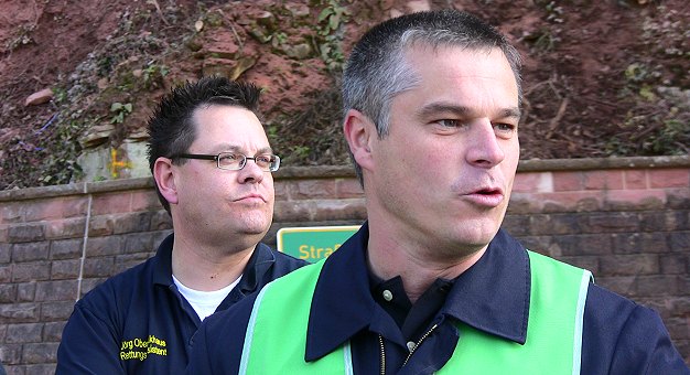 Länderübergreifender Großeinsatz nach Horrorunfall mit 30 Verletzten Jörg Oberkinkhaus vom Amt für Brand- und Katastrophenschutz beim Kreis Bergstraße und Stadtbrandinspektor Marco Albert von der Feuerwehr Hirschhorn (v.l.) erläutern die Übung. (Foto: Hubert Richter)Mehr Bilder (Klicken zum Vergrößern):