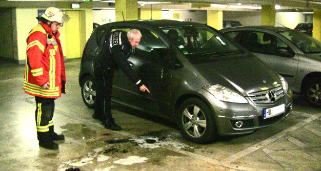 Vermutlich Brandstiftung an einem Mercedes (Foto: Hubert Richter)(hr) Erheblicher Sachschaden entstand am Nachmittag bei einem Brand in der Tiefgarage am Leopoldsplatz in Eberbach.