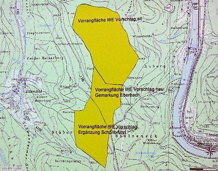 Ausdehnung auf Schönbrunner Gebiet (Repro: Hubert Richter)(hr) Weil im Rahmen der Erstellung des "Einheitlichen Regionalplans Rhein-Neckar" Vorranggebiete für die Windenergienutzung ausgewiesen werden sollen, hat der Gemeinderat sich bereits im Juli dieses Jahres auf mögliche Flächen innerhalb der Eberbacher Gemarkung geeinigt (wir berichteten). Heute stand das Thema erneut auf der Tagesordnung.