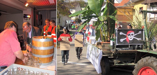 Sonntags startete der Kerweumzug bei schönstem Herbstwetter in Richtung Raingartenhalle. Der Saal war bis auf die letzten Plätze besetzt, und der Kerwepfarrer konnte aus dem Dorfleben berichten. Die Kerweborscht hatten zuvor über so manches Treiben der Einheimischen recherchiert. Die Musikkapelle Reichartshausen umrahmte den Sonntag musikalisch bis in die frühen Abendstunden.