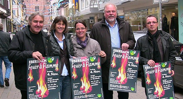 Am Freitag, 4. November, sollen anlässlich einer langen Einkaufsnacht lodernde Flammen Eberbachs Innenstadt in geheimnisvolles Licht tauchen, versprachen die EWG-Mitglieder (unser Bild) kürzlich bei der Vorstellung ihrer Aktion, die auch in diesem Jahr unter dem Motto "Feuer und Flamme" steht. Spektakulär werden dabei unter anderem wieder die Vorführungen von Feuer-Jongleur Jeremy sein. Um 18.30 Uhr wird er vor der evangelischen Kirche und um 19.30 Uhr in Höhe des Schuhhauses Fritz Karl seine Feuerzauber-Show zeigen. Kleider für Herbst und Winter von Max-Sportswear sowie die neuesten Brillenkollektionen von Optik-Meister werden um 18 Uhr und 20 Uhr bei einer Modenschau vor der Bahnhofstraße 27 präsentiert.