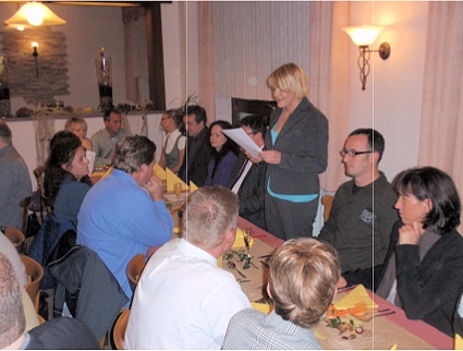 Nach einem Sektempfang und einem kurzem Plausch nahmen alle Personen im herbstlich gedeckten Saal der Gaststätte Platz. Zunächst begrüßte Stadtverordnetenvorsteherin Katharina Korner die Gäste. Danach sprach sie Dank und Anerkennung an ehemalige Stadtverordnete aus, die in der abgelaufenen Legislaturperiode 2006 bis 2011 kommunalpolitisch aktiv waren. Zunächst erhielten dafür die Anwesenden Prof. Dr. Reinhard Mauve und Michael Walter ein kleines Weinpräsent. Entschuldigt hatten sich für diesen Abend Prof. Dr. Christian Minuth, Thekla Raule und Matthias Streffer. Verabschiedet wurden auch zwei Mitglieder des Kommunalen Seniorenbeirats, Karl-Heinz Horter und Auguste Weber, die in den letzten fünf Jahren die Interessen der Senioren in Hirschhorn vertraten.