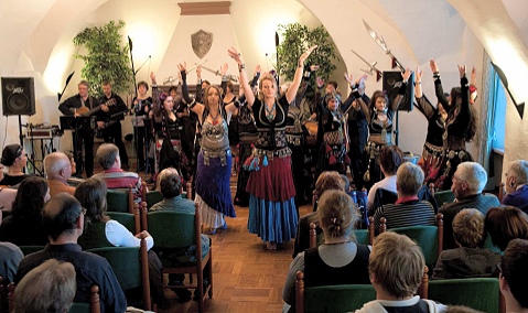 Jubiläumskonzert im Hirschhorner Schloss (Foto: privat)(bro) (hn/hr) Seit 20 Jahren gibt es das Folklore- und Percussionensemble "Grooveties" unter Leitung von Richard Köhler. Das Ensemble, das seinen Proberaum in Eberbach in der Pleutersbacher Straße hat, feierte das Jubiläum am Sonntagnachmittag, 16. Oktober, auf Schloss Hirschhorn mit einem kleinen Konzert, bei dem auch eine Folklore-Tanzgruppe mitwirkte.