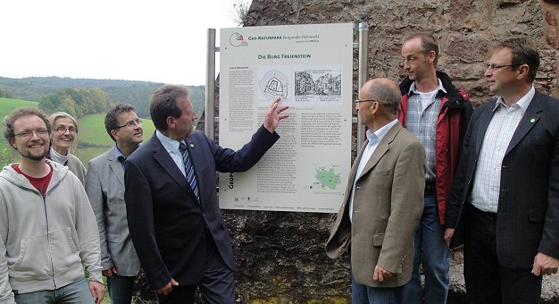 Die Teilnehmer überzeugten sich dabei vom weiteren Voranschreiten der Pflegemaßnahmen durch den Erbpachtnehmer Andreas Tilly seit dem Besuch im vorigen Herbst. Er stellt sich selbst die Aufgabe, die Burgruine wieder für die Öffentlichkeit zugänglich zu machen. Vorsitzender Landrat Dietrich Kübler brachte bei der am selben Tag stattfindenden Vorstandssitzung des Vereins Museumsstraße Odenwald-Bergstraße seine Freude über die Vorstellung der Geopark-Tafel zum Ausdruck.
