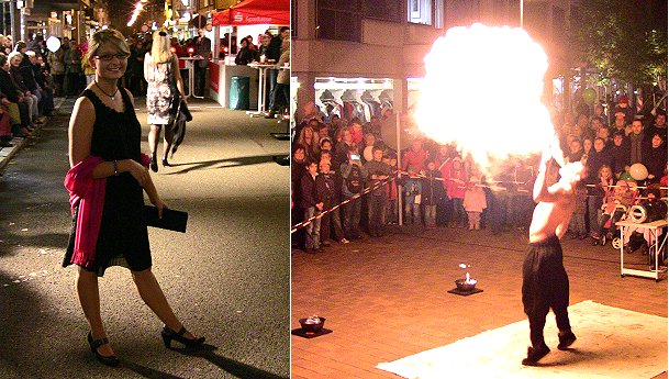 Straßenfest mit Einkaufsabend - Musikparty mit Castingwettbewerb Laufsteg auf der Bahnhofstraße: Modenschau und Feuerjonglage waren die Hauptattraktionen bei "Feuer und Flamme". (Fotos: Hubert Richter)(hr) Bei idealen Wetterbedingungen besuchten gestern zahlreiche Gäste das Straßenfest mit langem Einkaufsabend, zu dem die Eberbacher Werbegemeinschaft unter dem Motto "Feuer und Flamme" in die Innenstadt eingeladen hatte. Für junge Partyfans gab es anschließend in der Stadthalle ein Musikevent mit der Showband "Barbed Wire".