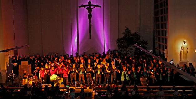 Erste Eberbacher Gospelnacht begeisterte Jung und Alt (Foto: privat)(hr) (wd) Ein zartlila angestrahltes Kreuz und einen in Gold getauchten Altarbereich konnten am vergangenen Samstag, 29. Oktober, die über 300 Besucher der 1. Eberbacher Gospelnacht in der katholischen Kirche St. Josef auf sich wirken lassen, bis der erste Chor die Bühne betrat.