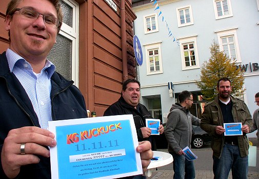 Da genau an diesem Tag die närrische Zeit beginnt, eröffnen die "Kuckucke" die Fastnachtskampagne 2011/2012 mit einem Showprogramm. Heute warben einige KGK-Aktive um Präsident Udo Geilsdörfer und Vize Markus Scheurich mit einer Flugblattaktion auf dem Leopoldsplatz für die Veranstaltung.
