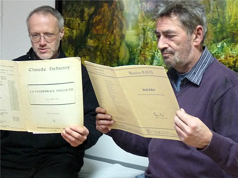 Von der Dunkelheit ins Licht Das Musikerduo beim gemeinsamen Notenstudium. (Foto: privat)(bro) (rau) Am Sonntag, 4. Dezember, um 18 Uhr geben Hartmut Tramer und Ronald J. Autenrieth ein ungewöhnliches Konzert in der Eberbacher Michaelskirche. Neben der Uraufführung eines Werks von Ronald Autenrieth zur Projektion großformatiger Gemälde Tramers liegt ein Schwerpunkt auf dem ausklingenden Liszt-Jahr, in dem der 200. Geburtstag des Spätromantikers gefeiert wird.