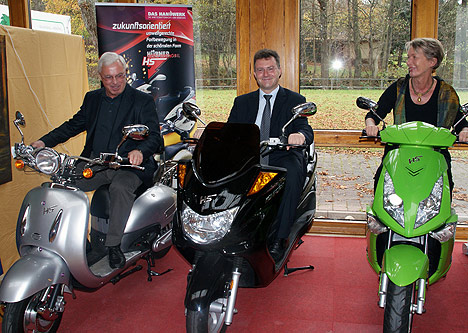 Beim abschließenden Rundgang durch die zur Messehalle umfunktionierte Sport- und Festhalle konnten die Ehrengäste die Stände von 35 Ausstellern und Vereinen besichtigen, die auf der Klimamesse unter anderem die Bereiche Elektromobilität, Energieeffizienz, regionales Wirtschaften und kommunale Beteiligungsmöglichkeiten an der Energiewende präsentieren. Auch die klassischen Themen wie die Erneuerbaren Energien und umweltverträgliches Bauen, Sanieren, Wohnen und Leben zeigen sich den Besuchern. Am Stand der Firma Elektro-Hübner ließen es sich Bürgermeister Erich Dambach und die beiden Politiker nicht nehmen, entsprechend ihrer Couleur sich fest in den Sattel eines Elektrorollers zu setzen.