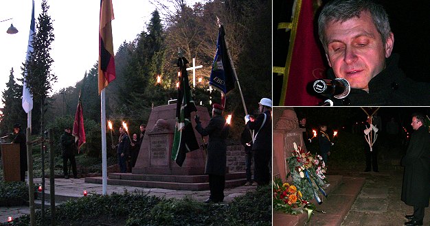 Nach der Verlesung des Gedenktextes des Bundespräsidenten durch Bürgermeister Bernhard Martin wurden Kränze am Ehrenmal niedergelegt. Organisiert wurde die Veranstaltung wieder von der Reservistenkameradschaft zusammen mit der Stadt Eberbach. Musikalisch umrahmt wurde sie vom Eberbacher Fanfarenzug, der Katholischen Pfarrkapelle und vom MGV Liederkranz. Wache am Ehrenmal hielten Fackelträger des Pfadfinderstamms Silberreiher.