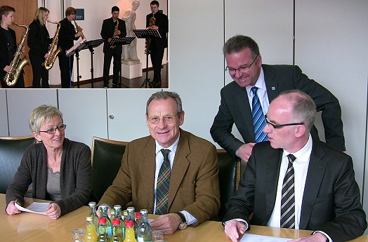 Am Rande der Sitzung konnten sich die Teilnehmer von den Leistungen der Eberbacher Musikschule überzeugen. Die "Anonymen Saxophoniker" mit Anton Wiese, Janina Wolf, Fabian Held, Pierre Moreira und Arne Wolf begrüßten die Gäste vor dem Ratssaal musikalisch (kleines Bild).