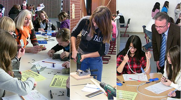 Fast 500 Schülerinnen und Schüler der Jahrgänge 8 bis 10 der Werkrealschule und der Realschule können in der Sporthalle der Werkrealschule an diesem Projekt teilnehmen und ihre Geschicklichkeit im handwerklichen und technischen Bereich ausprobieren. Man kann an den insgesamt 20 aufgebauten Stationen außerdem testen, ob man sich einen Beruf im mediengestalterischen Bereich vorstellen kann oder doch eher erzieherisch tätig werden möchte. Organisiert wurden die Projekttage von Beate Bissmann, Berufseinstiegsbegleitung an der Werkrealschule, und Brigitta Winzenried (Bild links), Lehrerin an der Realschule. Geschlechtergetrennt habe man die Jugendlichen heute zu den Projekten geschickt und werde dies auch morgen so durchführen, sagten die beiden Organisatorinnen. So können sich die Schülerinnen und Schüler ohne Druck und vor allem ohne die oft witzelnden Kommentare des anderen Geschlechts ihrer jeweiligen Aufgabe widmen, wie beispielsweise Ausschneiden eines Schlüsselanhängers, Zusammenschrauben einer Kabelverbindung oder der Umgang mit Schrauben und Muttern.